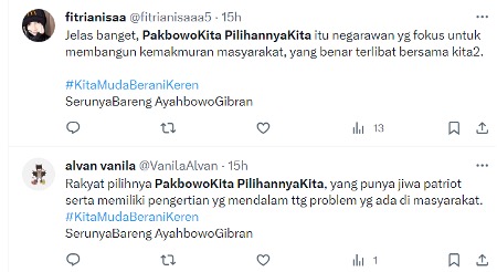 For instance, after the first debate on 12 December 2023 – in which Prabowo performed poorly and seemed unprepared to counter criticism from his rivals, breaking out in a nervous dance (his campaign trademark) whenever he felt cornered – numerous tweets suddenly appeared stating ‘Our Prabowo, our choice’, paired with the hashtag #KitaMudaBeraniKeren, ‘we are young, daring and cool’, and the line ‘such fun with father Bowo and Gibran’ (SerunyaBareng AyahbowoGibran). In similar wording, each of these posts praised Prabowo as a true statesman who will work sincerely for the people’s welfare.